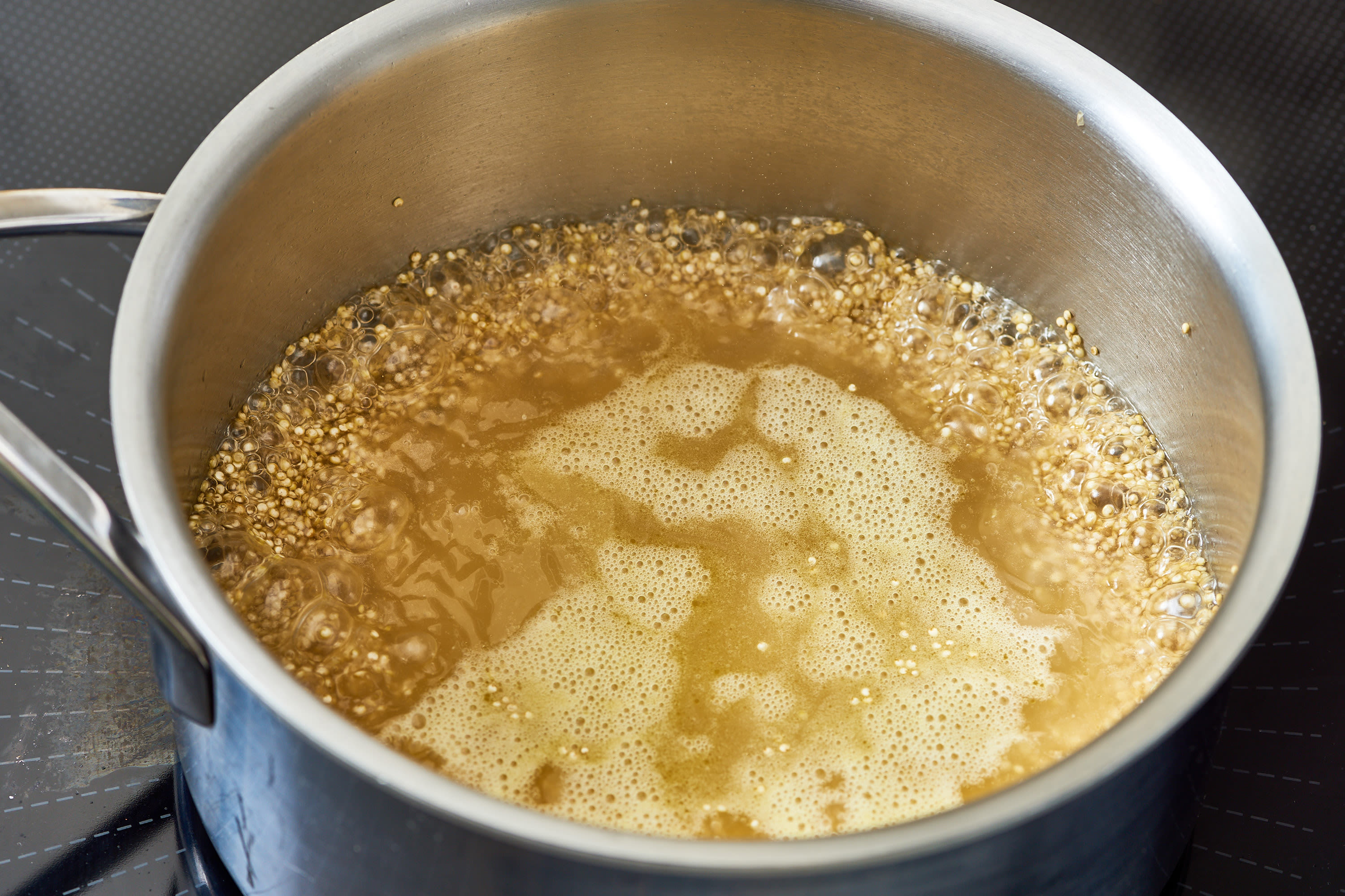 Add the liquid and bring the pot to high heat. In a small sauce pot, place the dry quinoa over medium heat and toast for 5 minutes. Reduce the heat, cover the pot, and let it simmer for 15 to 20 seconds. If the quinoa still looks wet, continue to cook, checking every 5 minutes. Bring to a simmer, then cover and cook over low heat until tender, about 15 minutes.